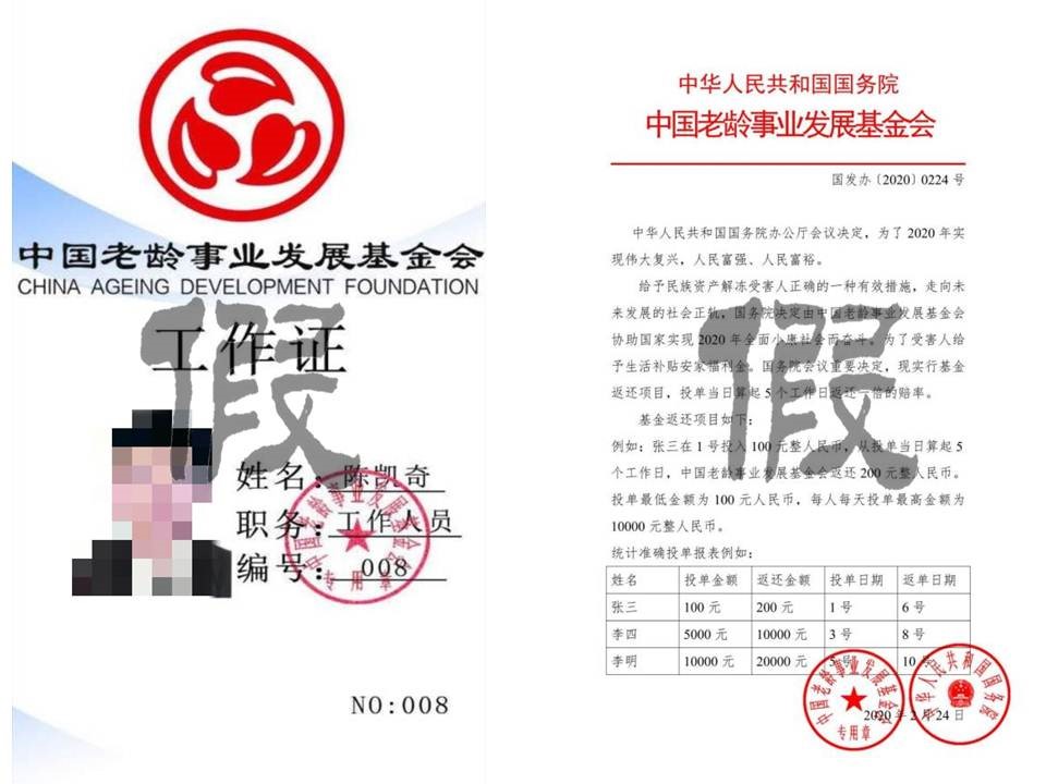 二、陳凱奇等不是中國老齡事業發展基金會工作人員,我會從未與此人有過任何聯系,從未開展過任何合作,其所持“工作證”非我會制發。