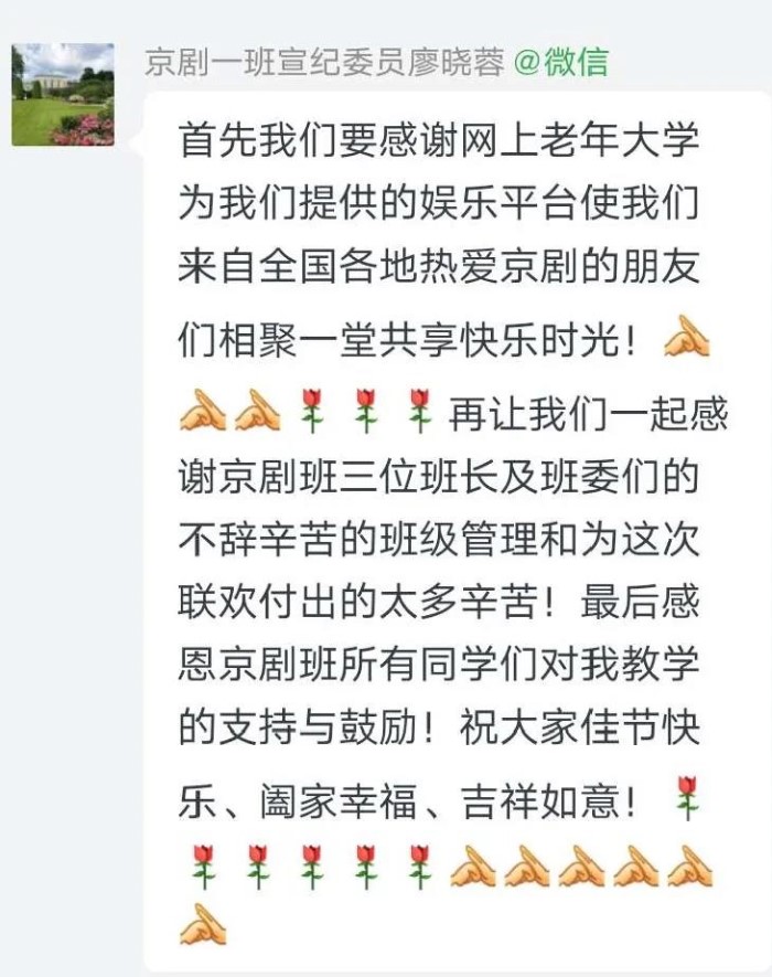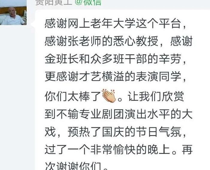整場晚會井然有序,和(hé)諧溫馨,參演節目質量高(gāo)、藝術性強,全班參與,互動性強。不僅秀出了網上老年(nián)大學(xué)京劇班學(xué)員的(de)學(xué)習成果,更彰顯了新時代老年(nián)人的(de)良好精神風貌。這場由網上老年(nián)大學(xué)京劇班班委組織開展的(de)線上“月滿中秋 舉國同慶”國慶聯歡晚會取得了圓滿成功,為(wèi)往後各班在線開展活動起到了很好的(de)示範作用。